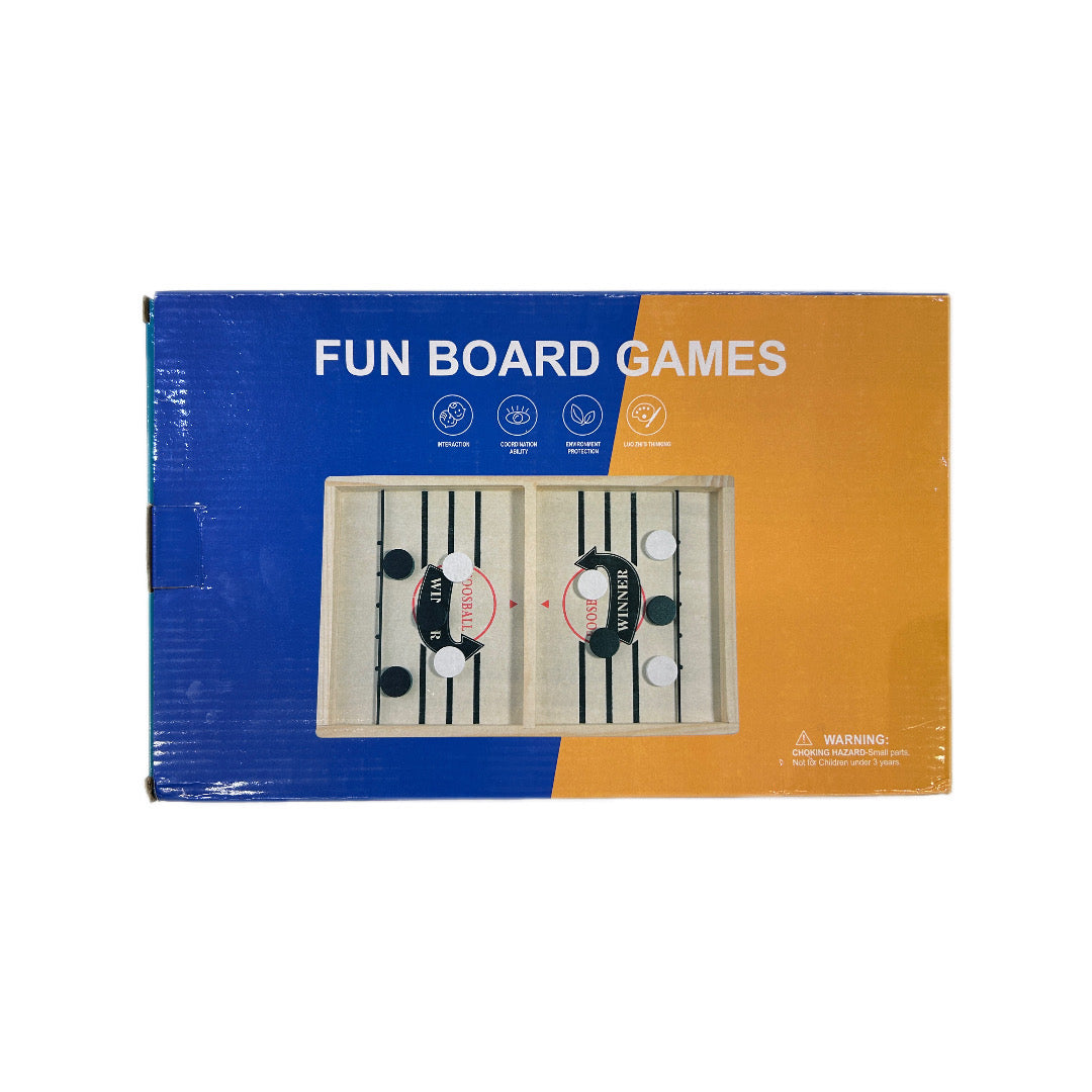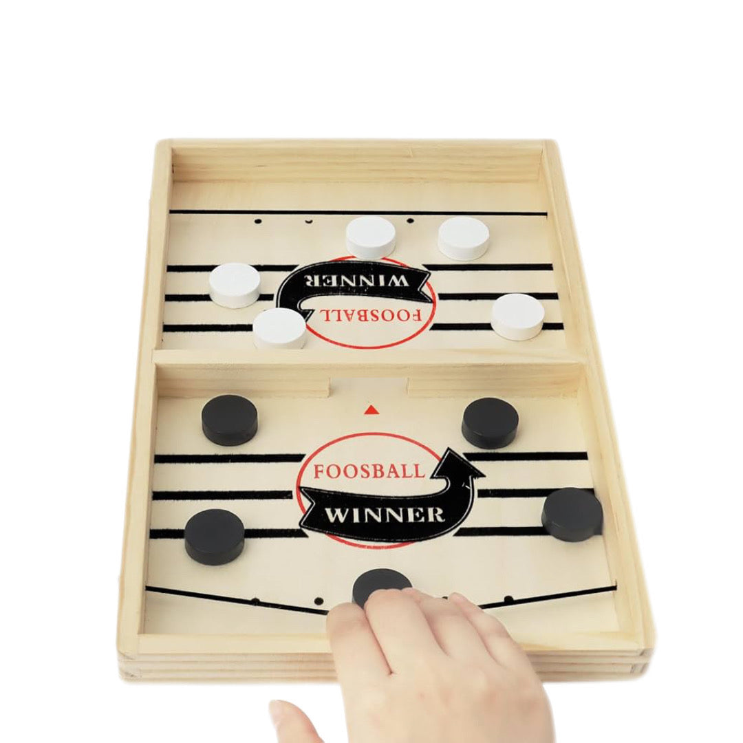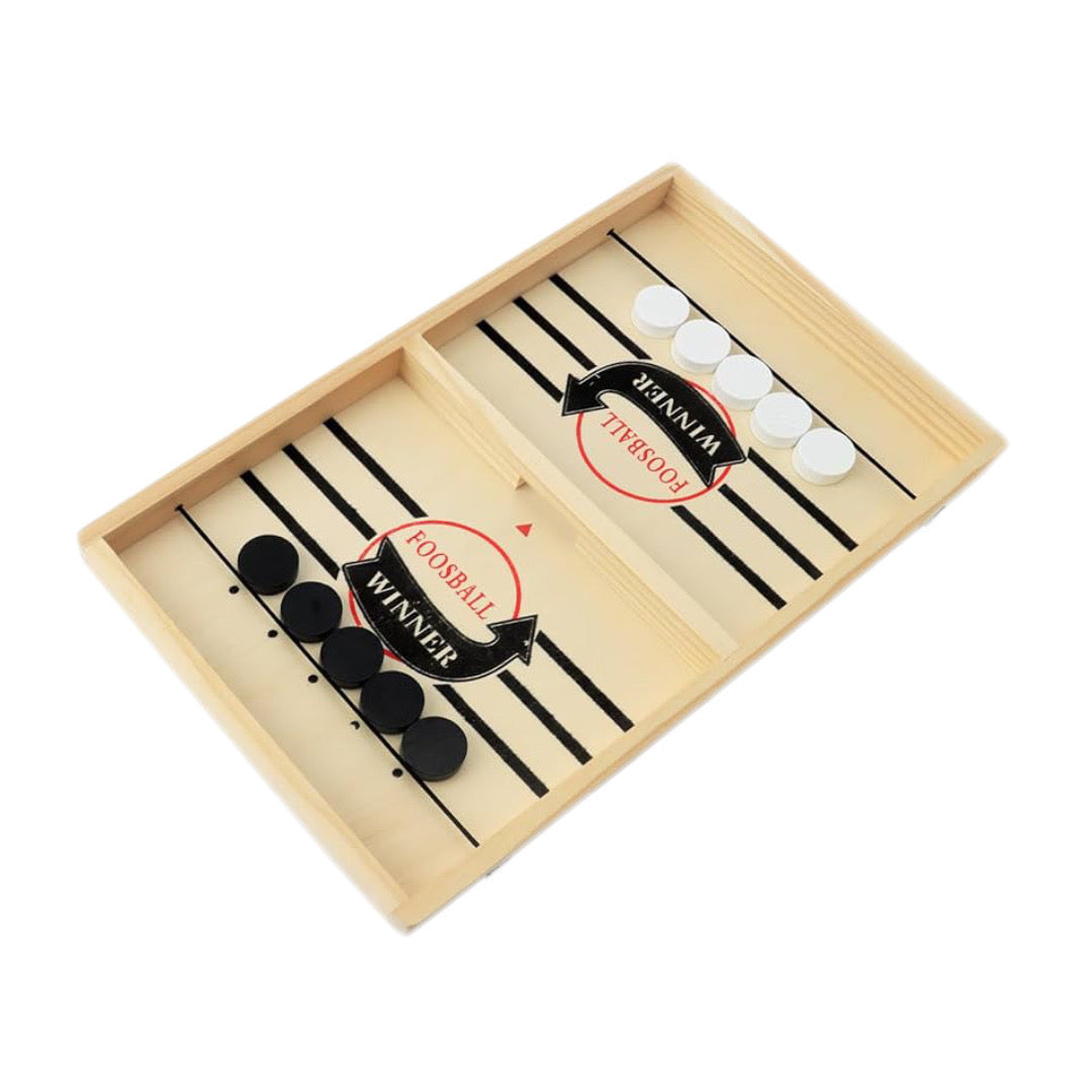 حيث يتنافس اللاعبون لإرسال الأقراص الخشبية إلى الطرف الآخر من اللوح باستخدام الشريط المطاطي
