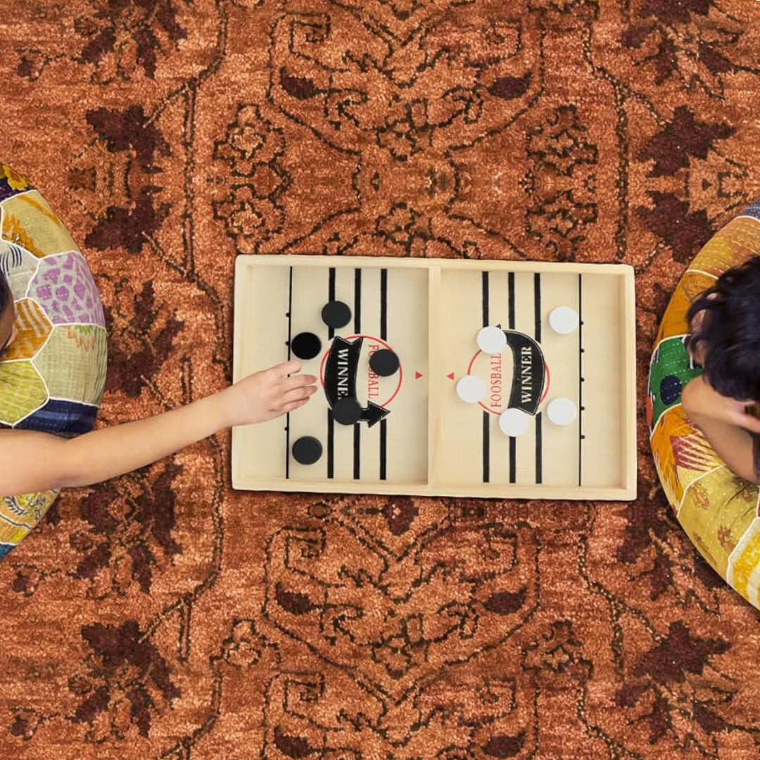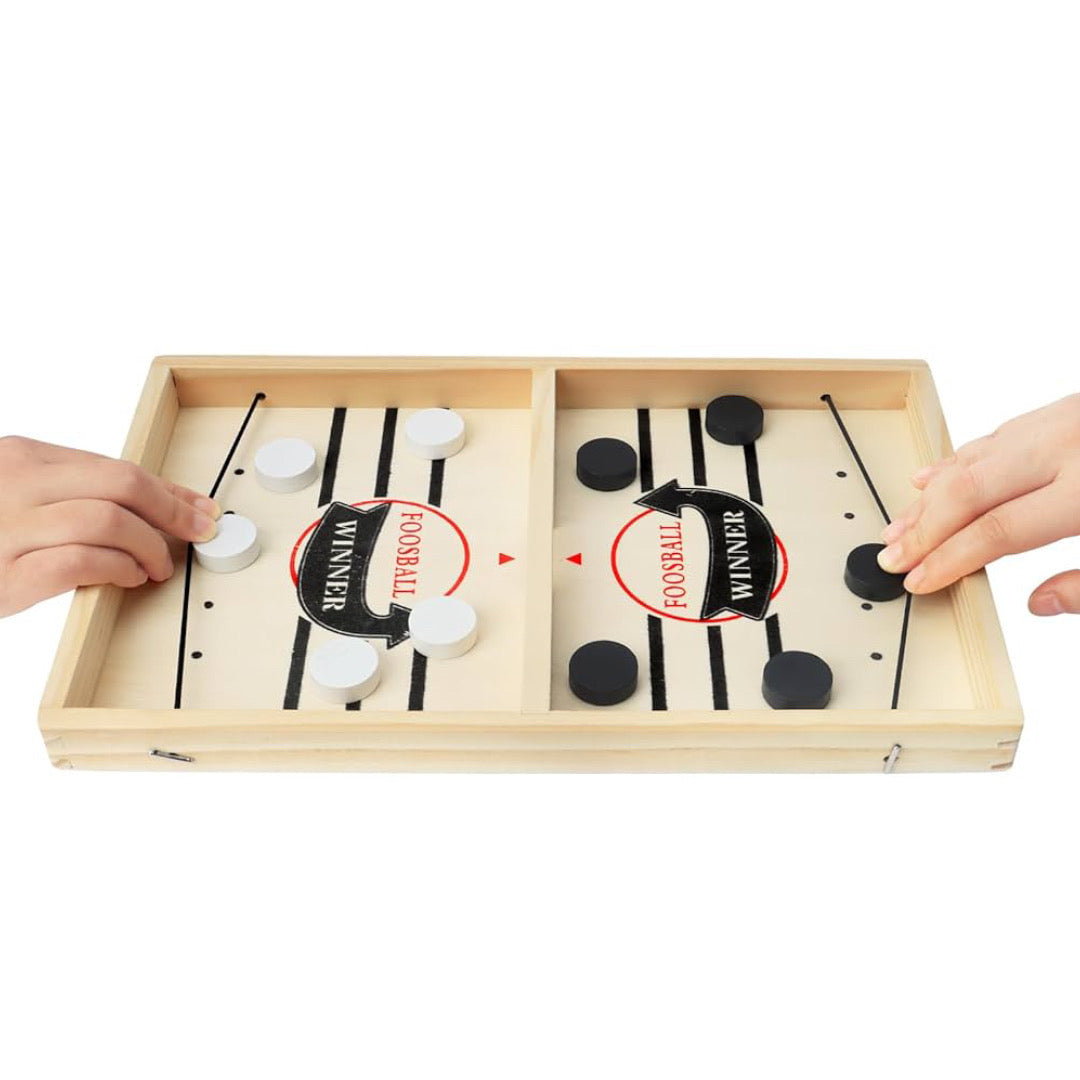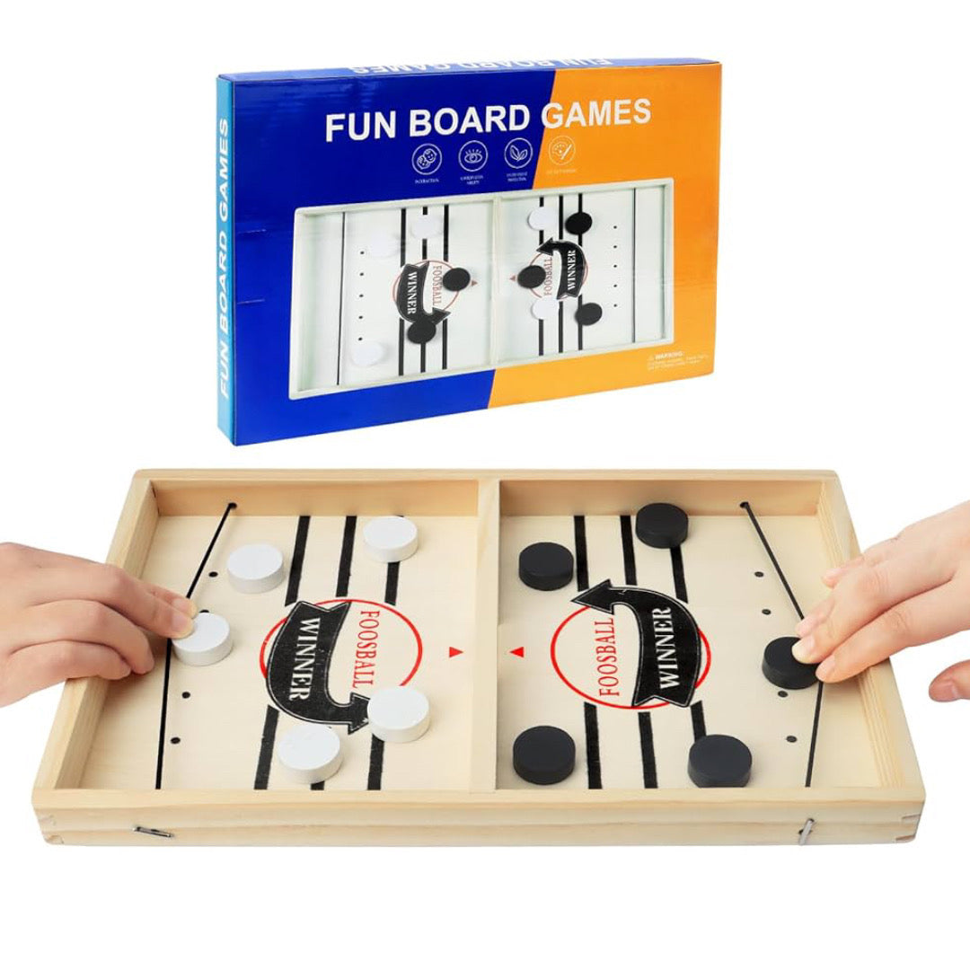 حيث يتنافس اللاعبون لإرسال الأقراص الخشبية إلى الطرف الآخر من اللوح باستخدام الشريط المطاطي
